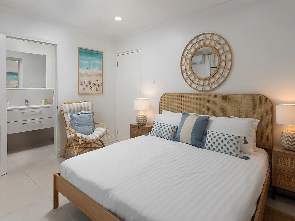 Primary Bedroom Suite: Located on the upper level with direct access to the patio, ideal for enjoying sunsets and ocean breezes.