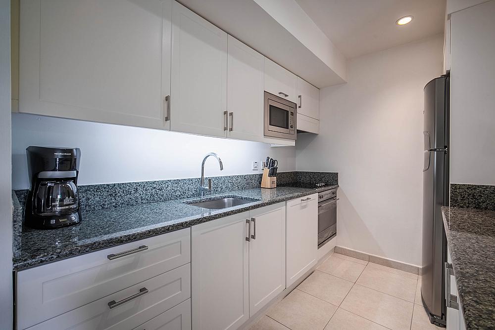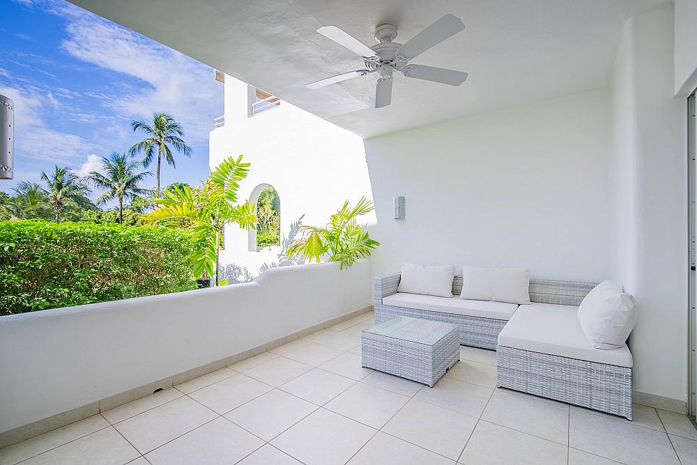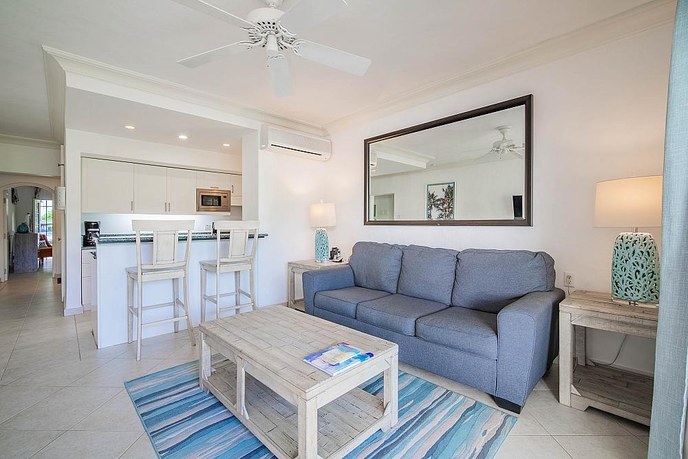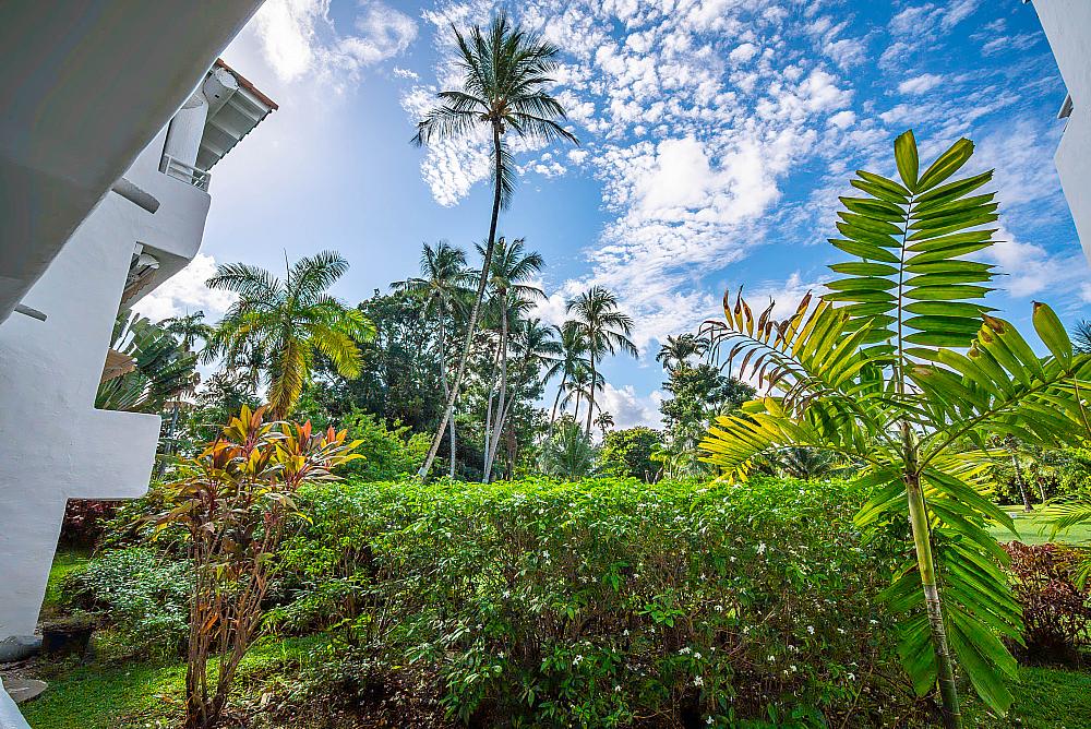 It sits on the first level in the last block of apartments from the beach. It therefore enjoys views over lush gardens and the beautiful Caribbean Sea.