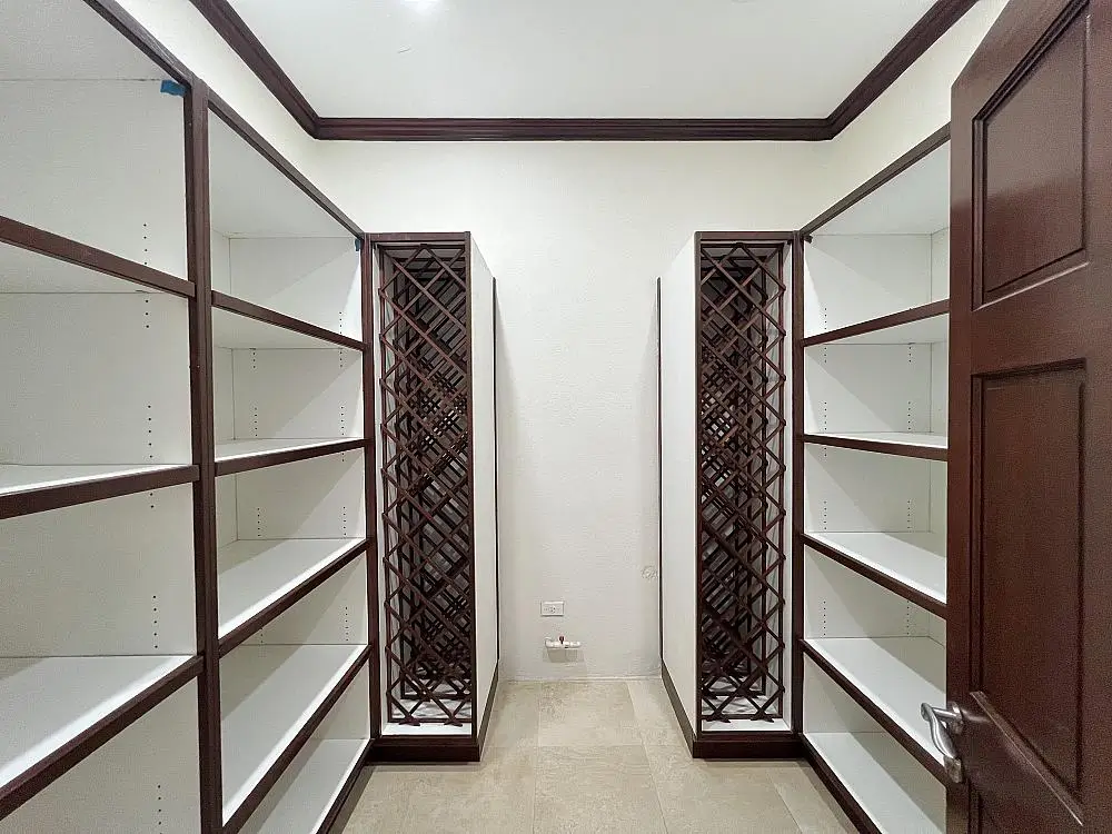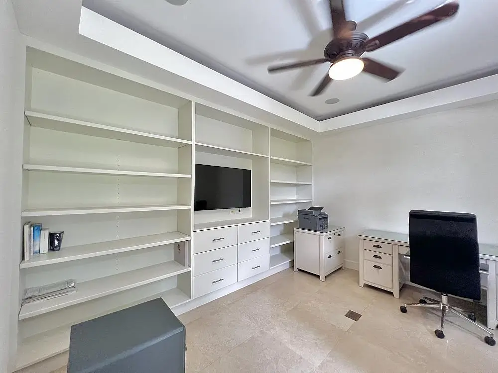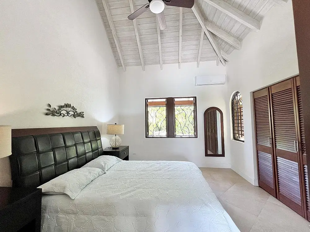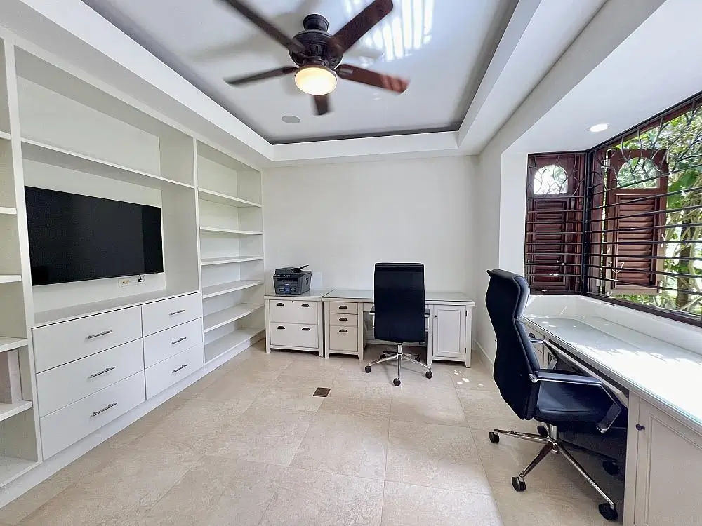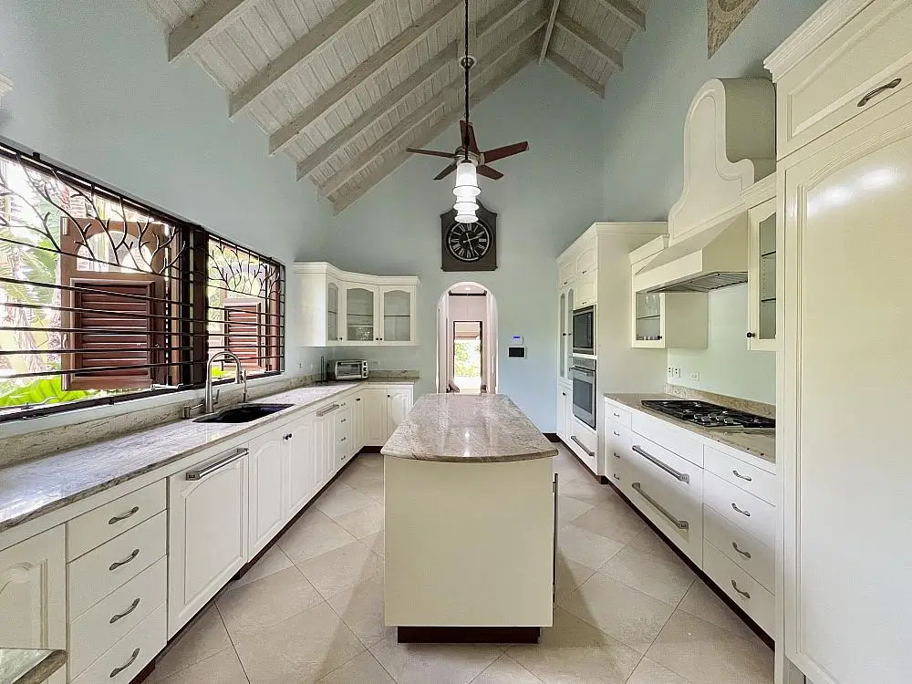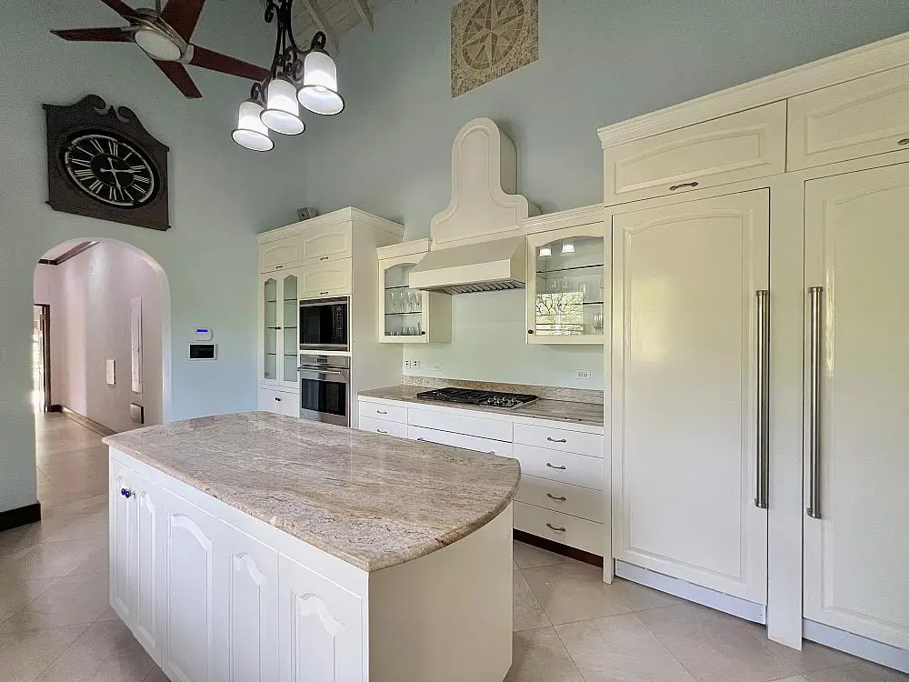 The front entrance to the villa is through a garden that leads to a gazebo where you’ll find the large front doors that open up to a gorgeous accent wall. To the right, you’ll find a large office and powder room; to the left, you’ll find the large living and dining space. The spacious kitchen has a full fridge and freezer, a large gas stove and oven with a gorgeous island, great for letting your inner chef shine. Not to mention the window detail over the sink, which blows the cool island breeze through the room.