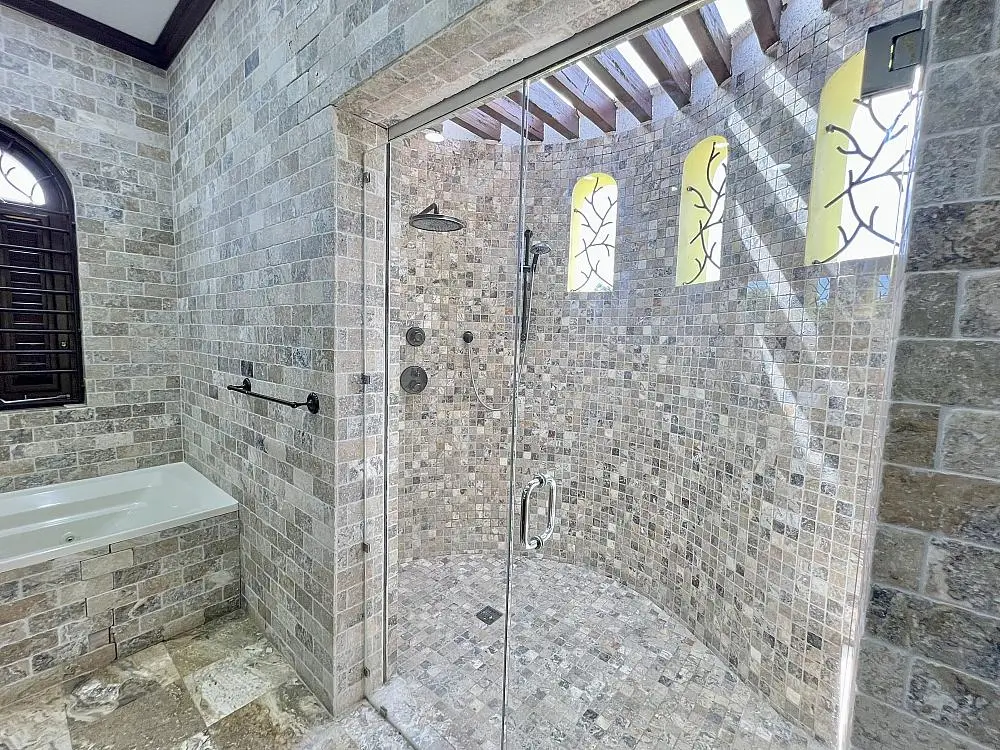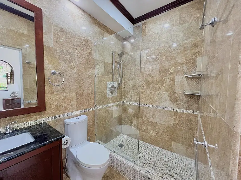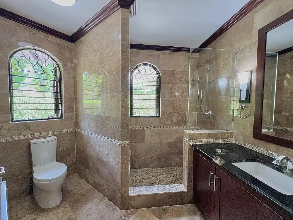 Down the hallway across from the living space, you’ll find all 4 air-conditioned bedrooms with ceiling fans; 3 large double rooms, each with a closet and en-suite bathroom - all bedrooms lead onto the outdoor terrace where you can relax and enjoy the ocean views from every angle. The master bedroom boasts a spacious and comfortable feel with a walk-in closet and a large en-suite bathroom with a double vanity sink, full tub and an enclosed outdoor shower (the main attraction!)