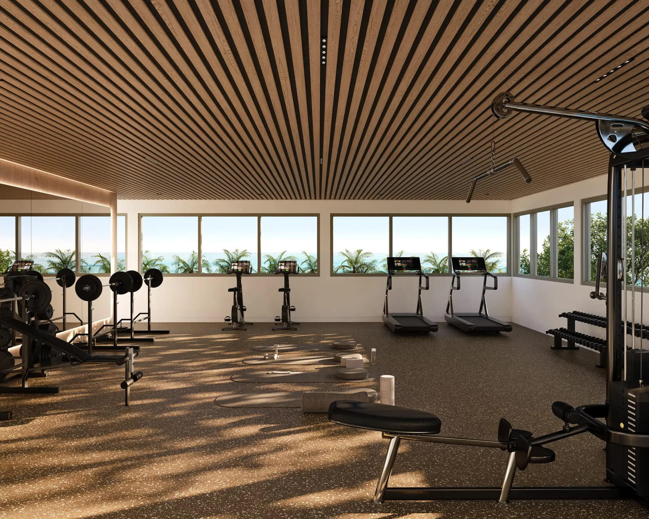 The rooftop also hosts a dedicated wellness pavilion with hammam, cold plunge, private massage room, and shower facilities, alongside a fully air-conditioned ocean-facing fitness studio. This elevated environment offers a rare blend of wellness, social connection, and quiet retreat high above the shoreline.