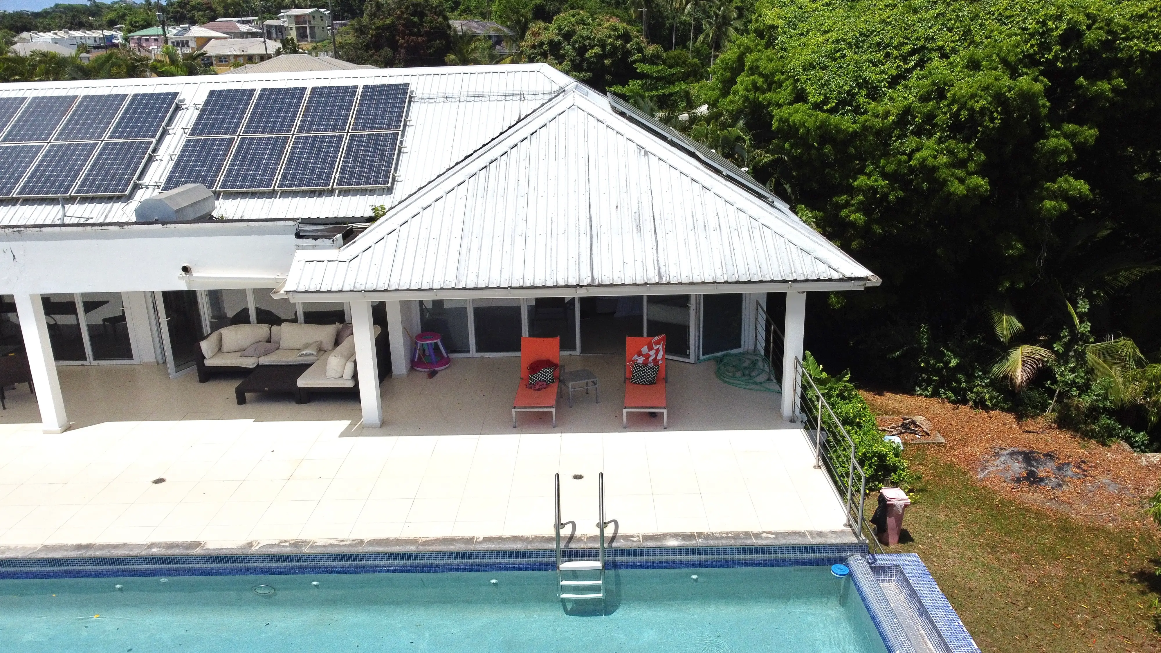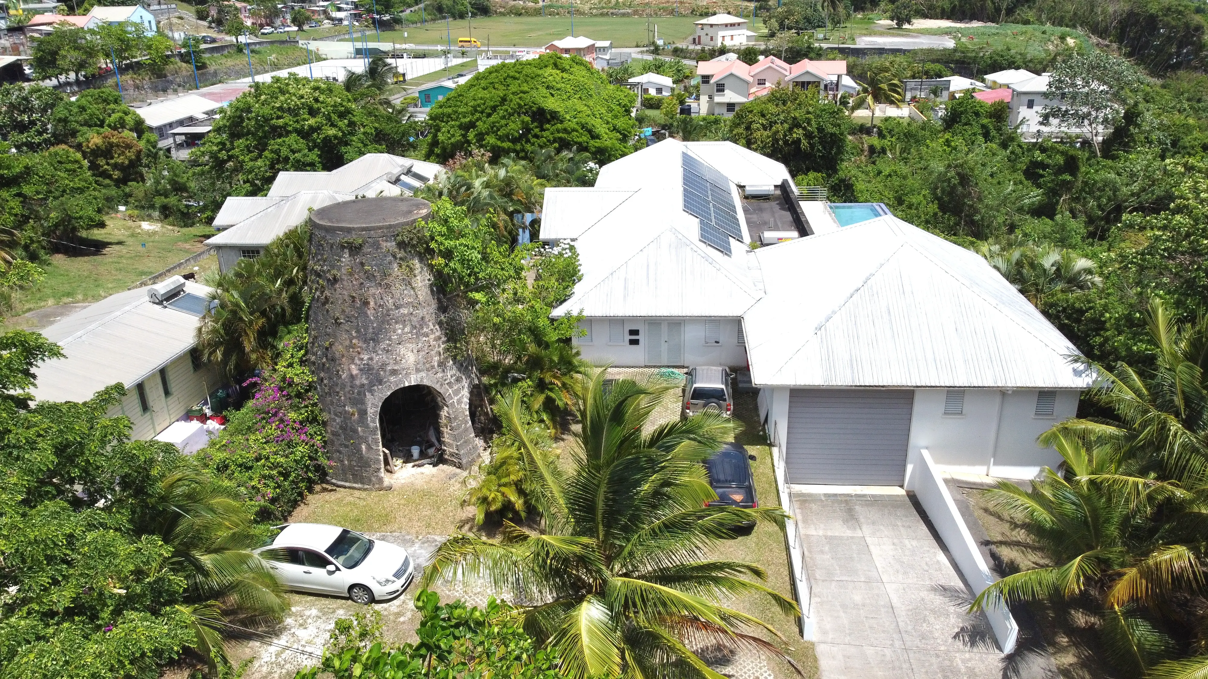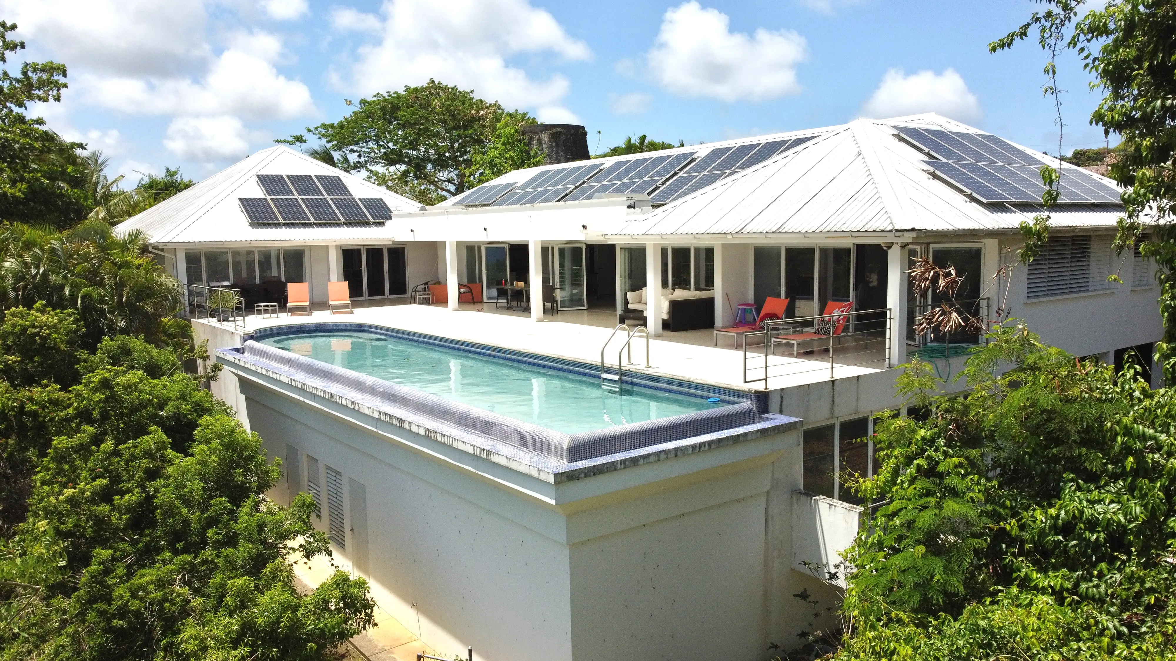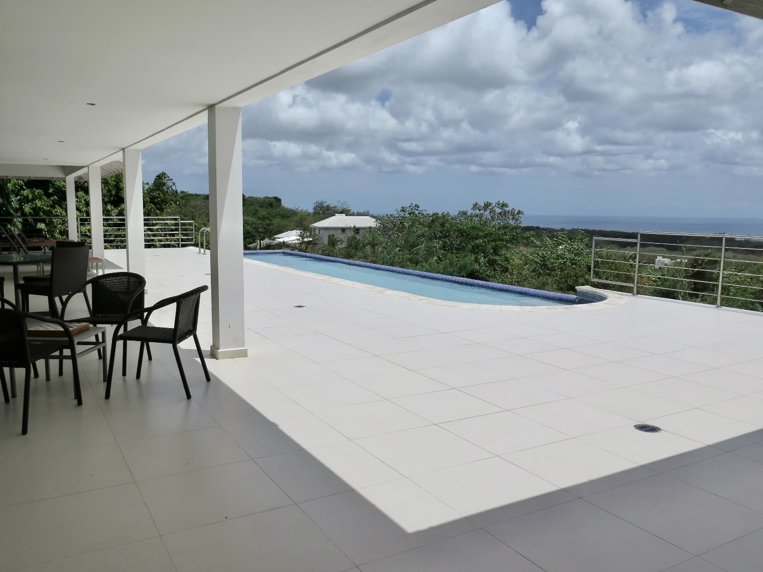 There is a beautiful Sugar Mill Tower in the front of the house which could be converted into anything one might want and then one enters into an open plan kitchen and living room overlooking the patio and pool and the stunning view beyond.