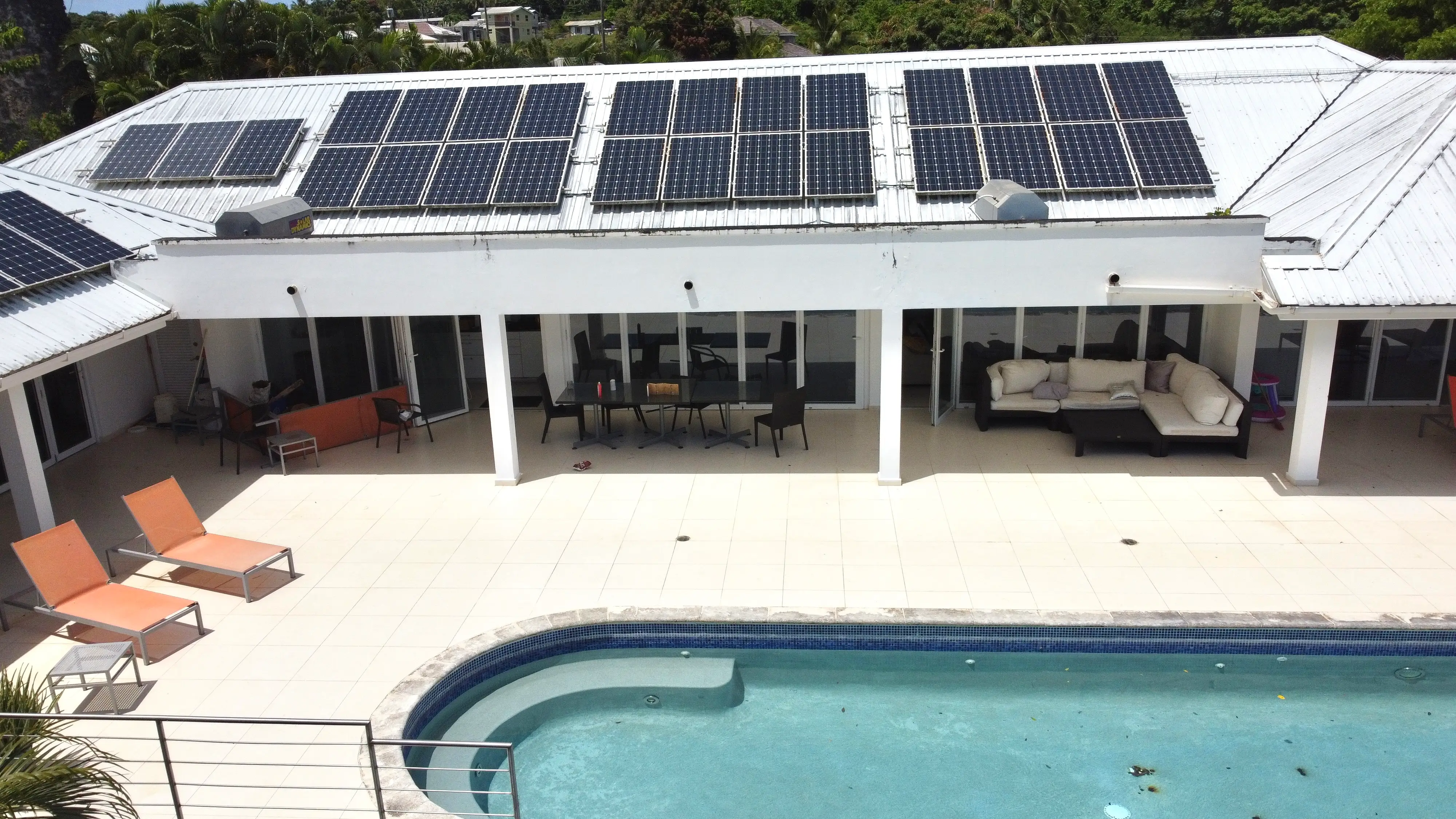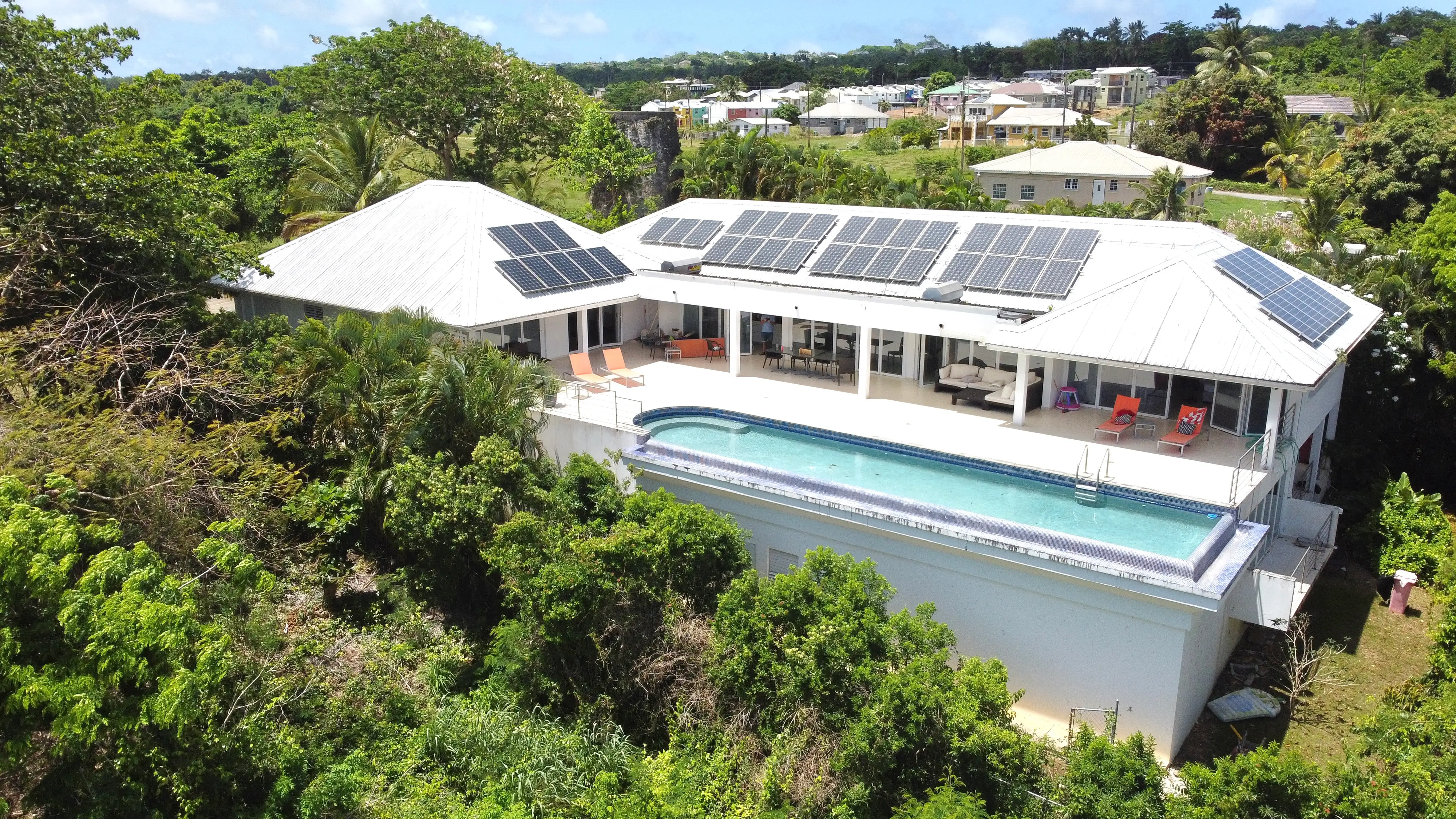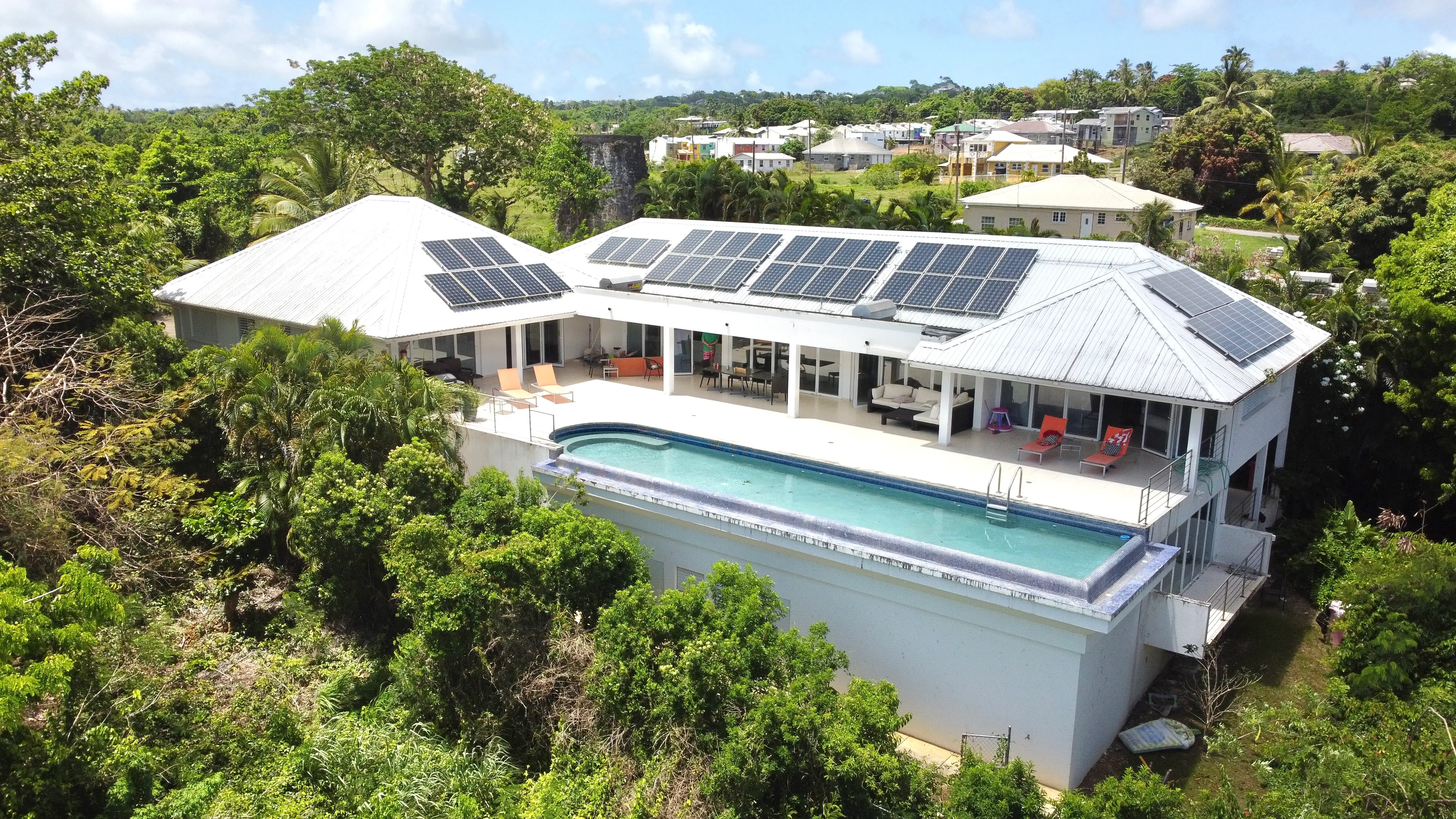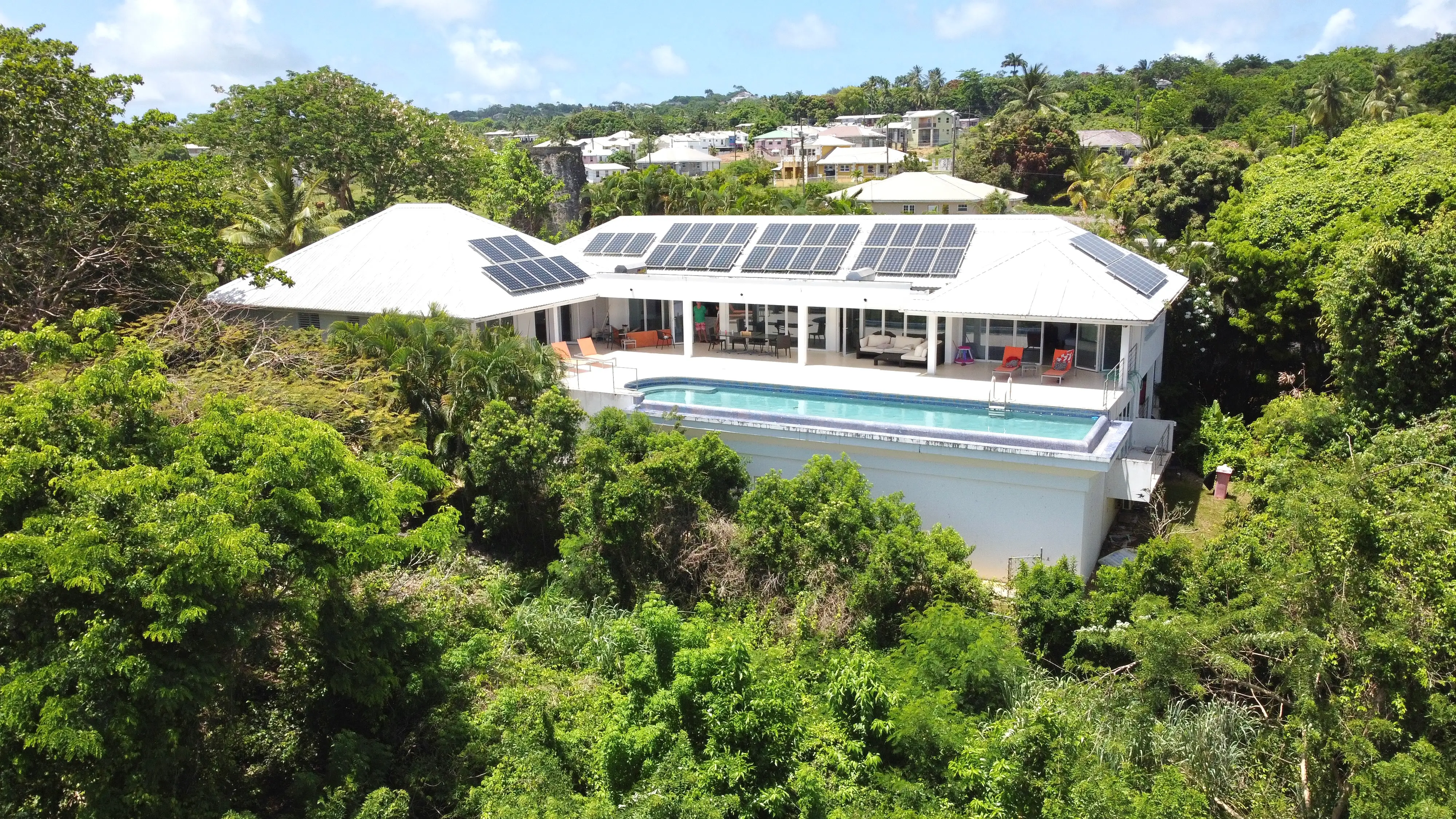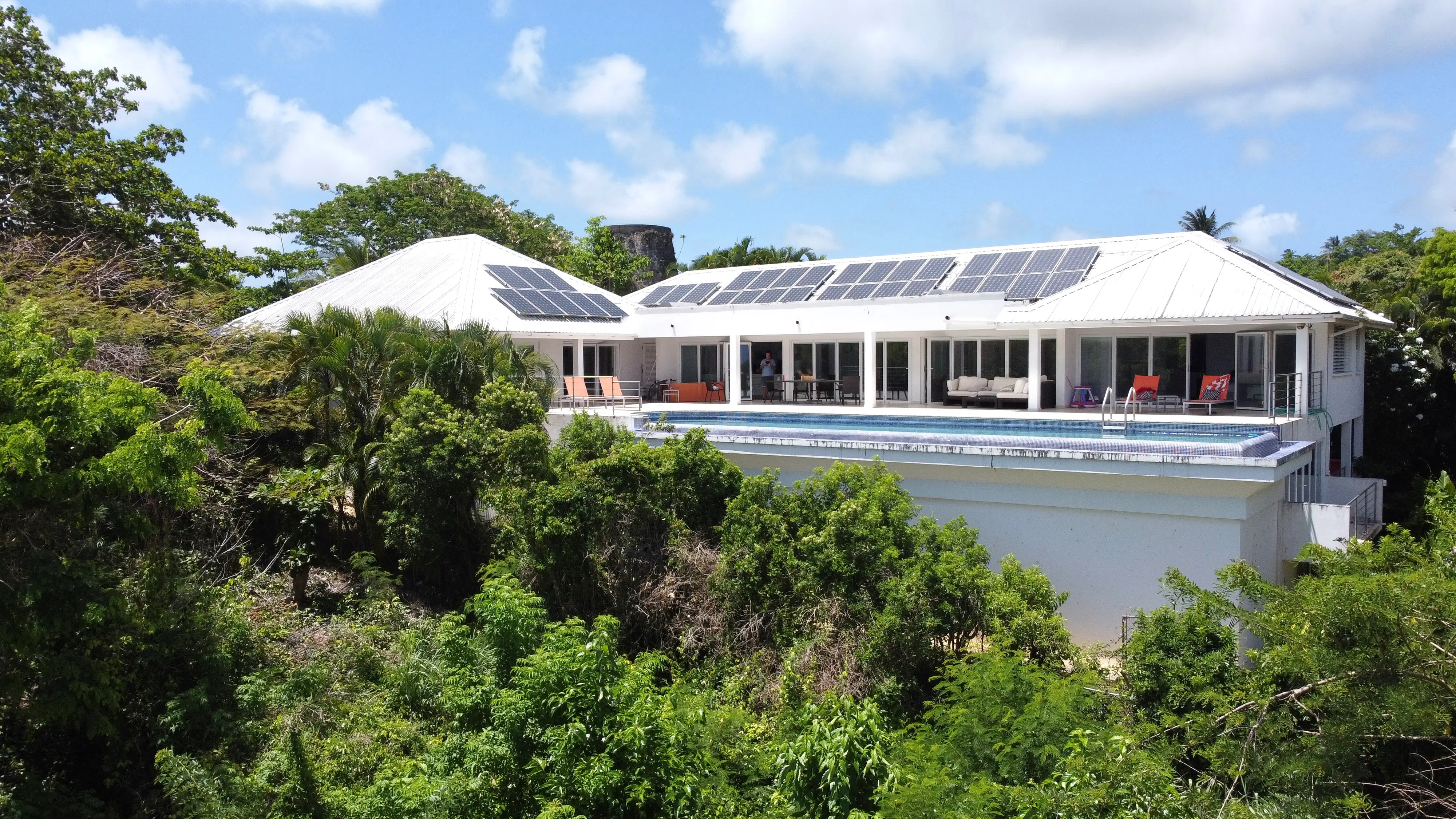 There is a beautiful Sugar Mill Tower in the front of the house which could be converted into anything one might want and then one enters into an open plan kitchen and living room overlooking the patio and pool and the stunning view beyond.