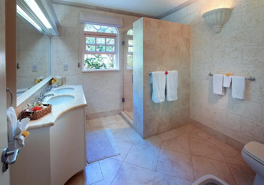 The two upstairs master suites feature king-size beds and private balconies that overlook the pool deck and beautifully landscaped gardens. Three additional bedroom suites are located on the ground floor and feature twin beds that can be pushed together or separated as needed. The upstairs master suites include both a bath and a shower, while the downstairs bedroom suites have showers only.