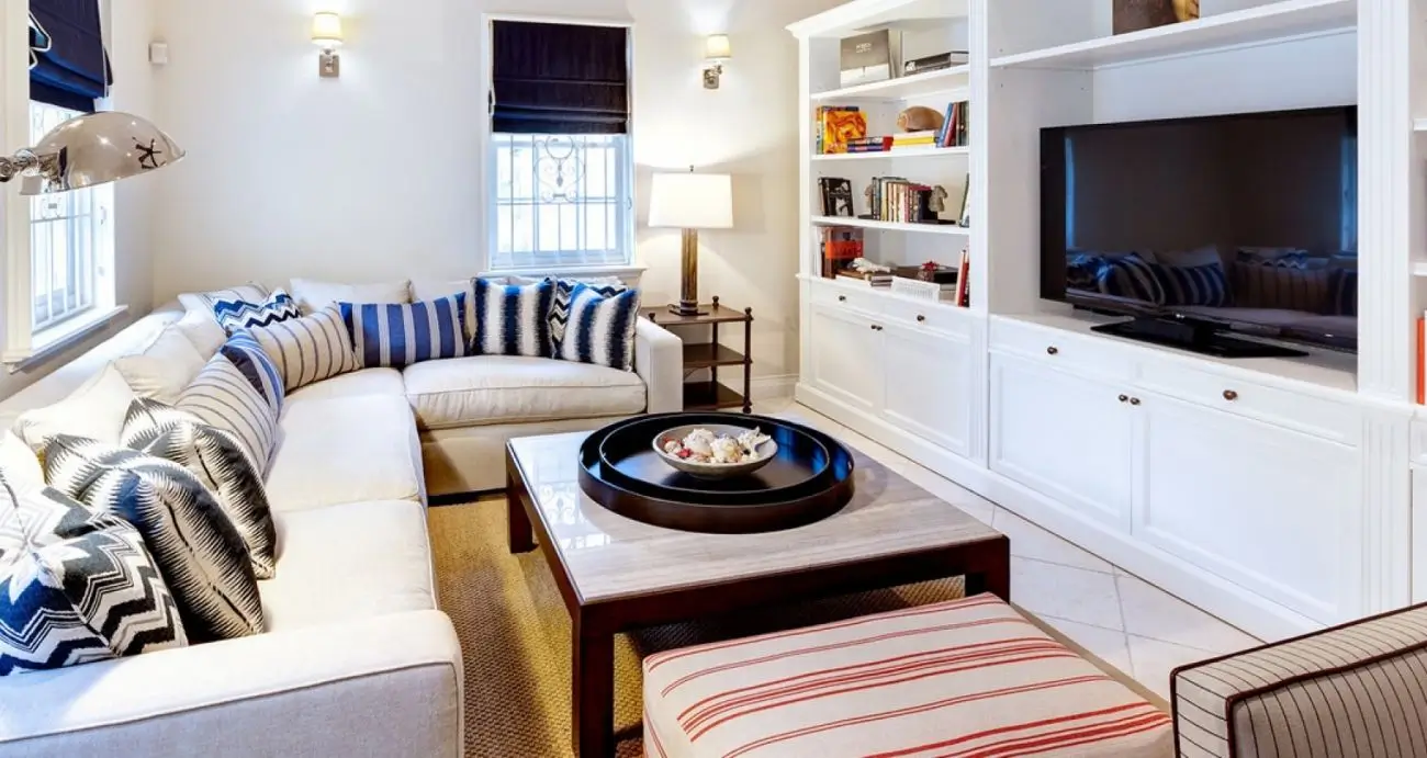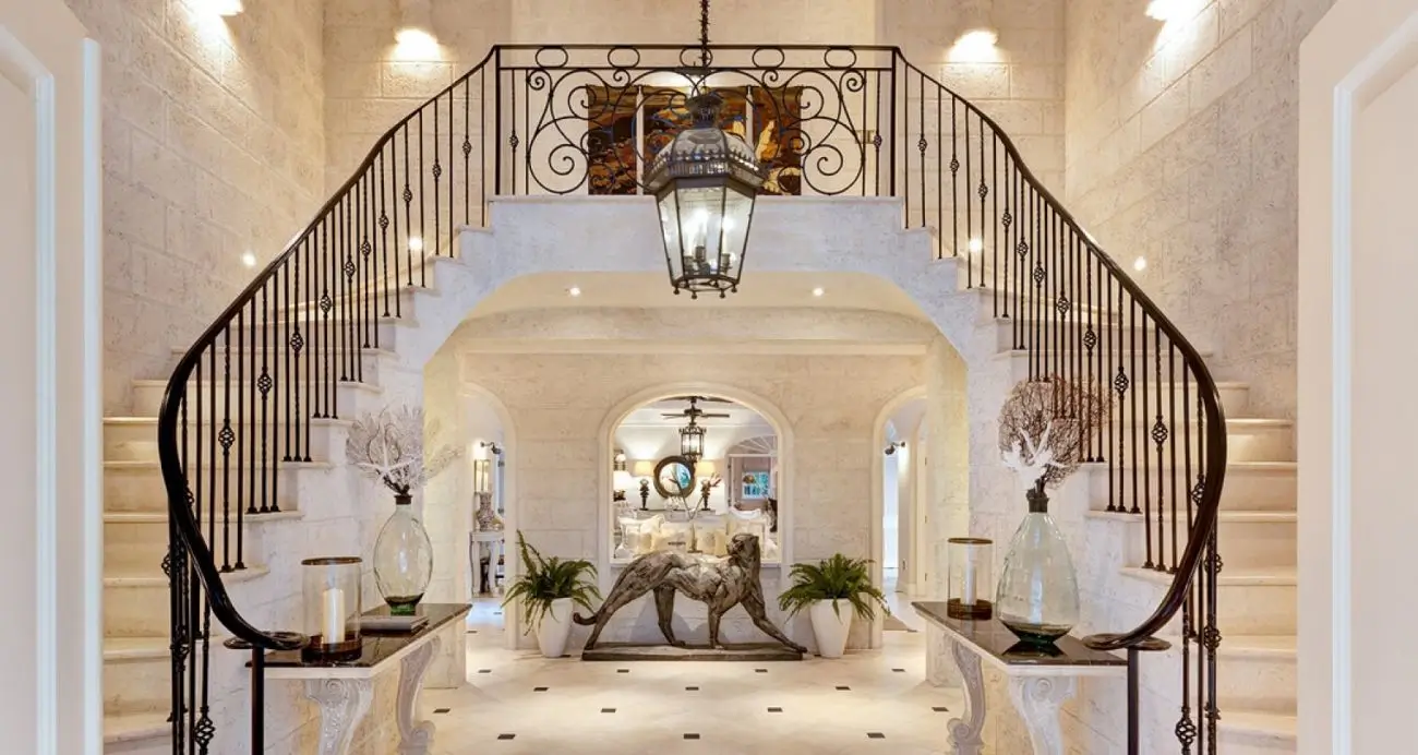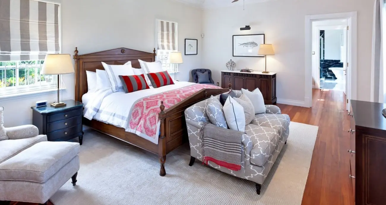 Windward has many striking features, and one of these is apparent once you walk through the front door. Beautifully designed double staircase, polished off with wrought iron railing, leads upstairs. In between these stairs is an eye-catching statue of a black panther. Another feature is the line of French doors that, when opened back, create a magnificent indoor/outdoor feeling. The walls are painted a bright beige colour, which helps the natural light pour into the living room area.